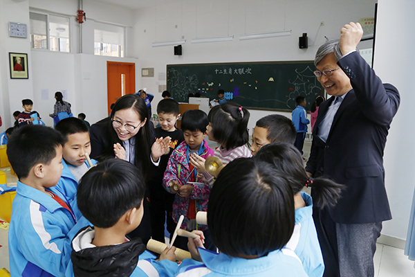 郭老师和姚老师兴高采烈地与孩子们一同加入到演奏乐器行列来