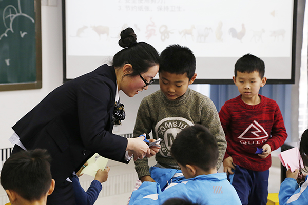 老师为孩子们示范剪纸艺术